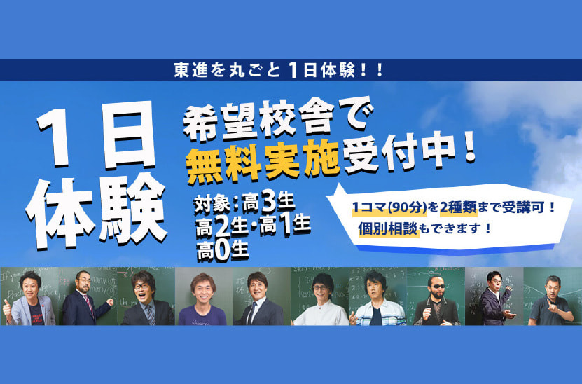 大学受験という勝負の場において、合否を決めるのは、自分の能力だけではなく、与えられる授業の質(東進は最高峰の授業)と授業の与えられ方(東進ならではのシステム)と努力の差。つまり必要十分な勉強の質と量。ただそれだけなのです。そこで大切になるのは、「絶対に合格できる」という強い自信です。東進でなら、自信を持てます。